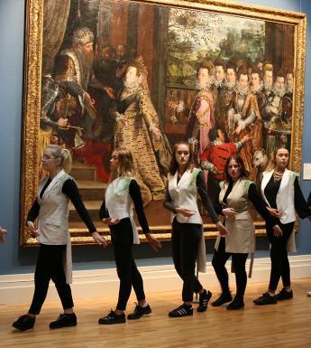 Performance artist Amanda Coogan walking through the National Gallery of Ireland as part of her performance Floats in the Aether.