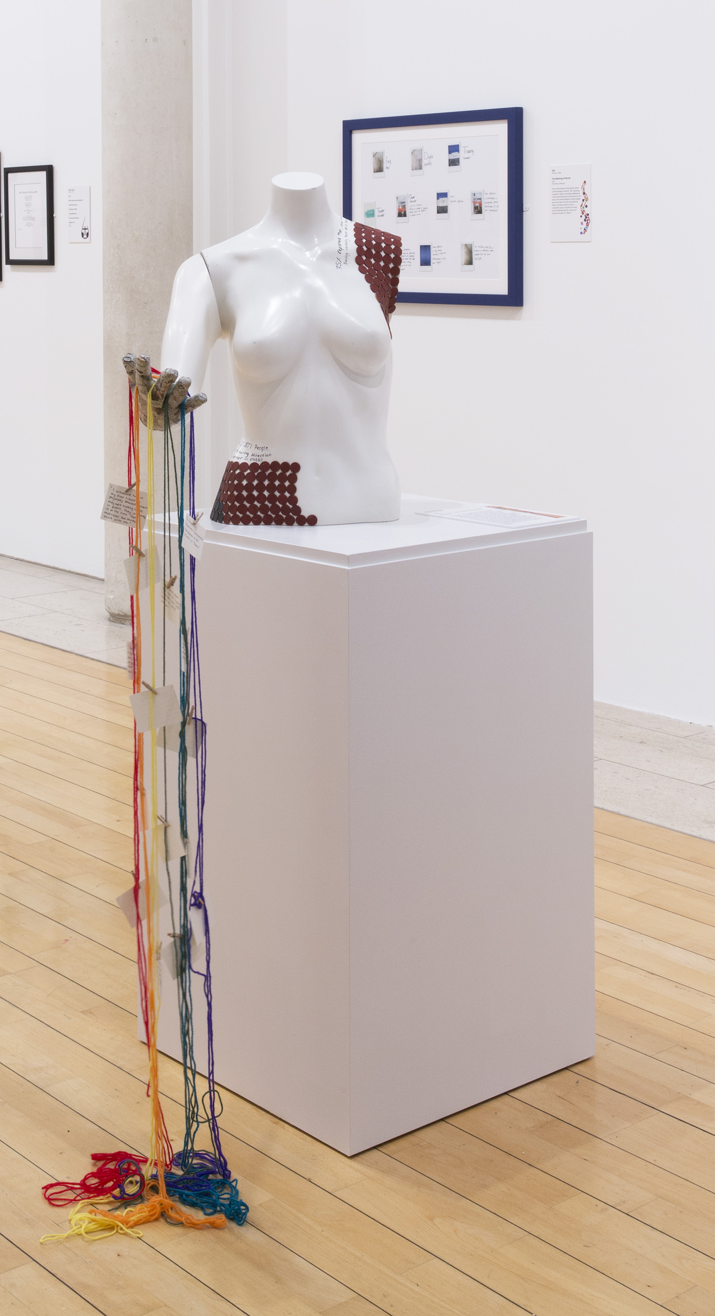 Mannequin, papier-mâché, wool, framed artwork