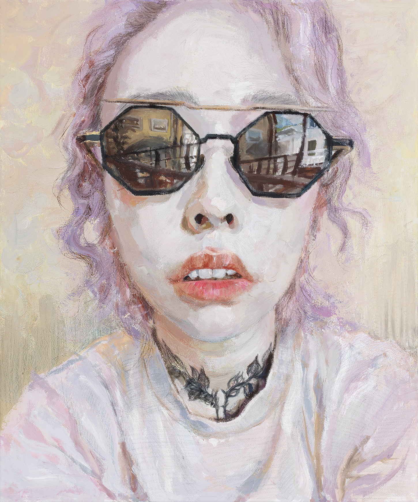 A drawing of a woman with lilac hair wearing sunglasses. In the glasses, we see the reflection of an interior, and an exterior