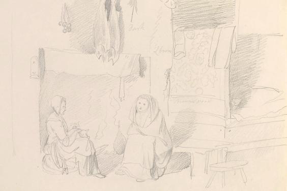 This attention to detail is also evident in Maria’s sketchbooks, which are kept in the Prints and Drawings collection at the National Gallery of Ireland. Maria liked to draw landscapes and people in her sketchbooks, using ink and sharp graphite to create fine lines and balanced compositions. Like many artists, she used sketchbooks to develop her ideas for final paintings. We can see this in sketches like the one highlighted below, which appears to be a study of castle ruins similar to those seen in the background of Patron’s Day at the Seven Churches, Glendalough.