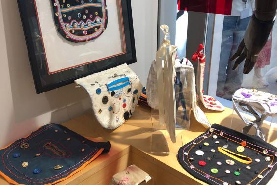 A selection of the pieces created are now on display in the Gallery Shop window. They were created by project participants in one of two styles. The Saccoccia style pockets are pear shaped, and were a tie-on pocket worn by women in sixteenth-century Italy. They are amongst the earliest examples of this decorative and useful item of clothing. Similar traditions can also be seen in the Traveller Community’s custom of making and wearing beady pockets, the second style on display. Made by Traveller women, these are traditional handmade items designed to be worn around the waist and used in a similar way to a modern handbag, carrying and keeping the wearer’s personal items.